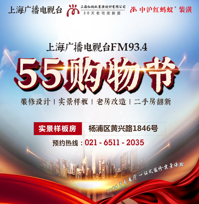 為了全面推動首次“五五購物節”,上海紅螞蟻裝潢設計有限公司將在5月5日當天與上海新聞廣播FM93.4,上海交通廣播105.7,899都市廣播三臺聯合同播55購物直播活動,此次直播將給出超強的活動優惠力度。